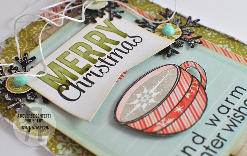 For today's card, I combined two of the newest stamp sets: Bring on the Merry and Be A Barista.I also used the larger Tag Me die on the Merry Christmas sentiment panel (I just trimmed off the top). The papers are from Pink Paislee's City Sidewalks line.