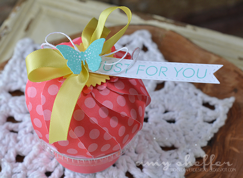 I wrapped each cup, topped with Paper Puff Toppers, then embellished with Limeade Ice bows, Keep It Simple: Just For You tags, and Bitty Butterflies.