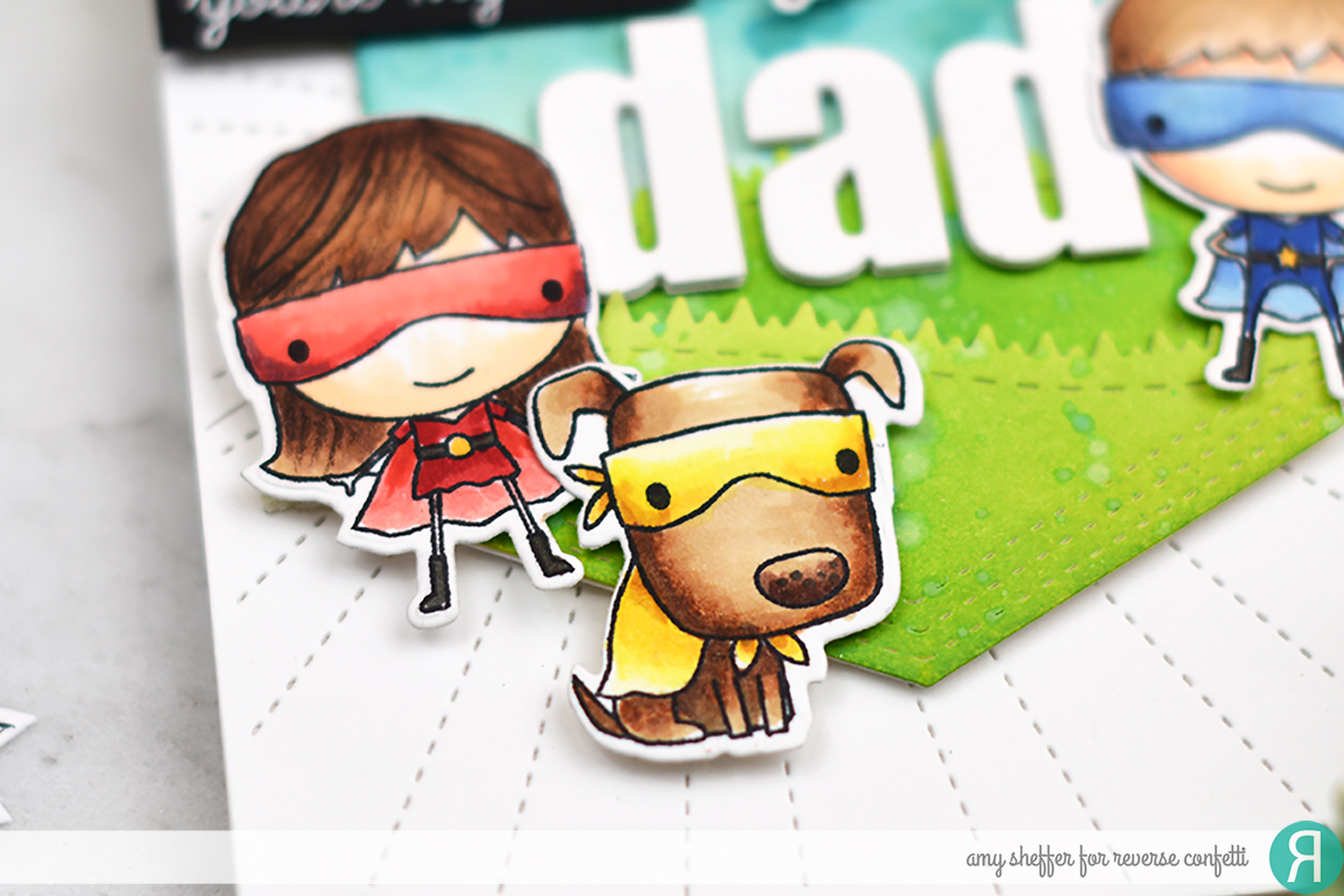 For the background, I ink-blended some yellow inks onto a STITCHED RAYS COVER PANEL die-cut, then cut out the sentiment with the YOU'RE SUPER DUPER Confetti Cuts, then layered that onto a card base that I very lightly ink-blended with some light aqua ink.